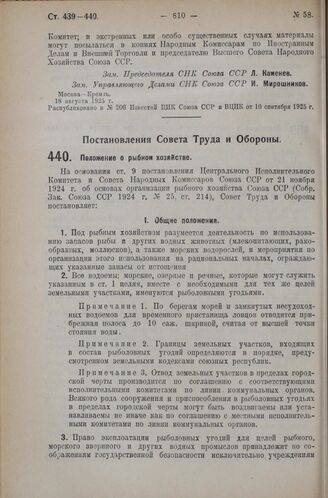 Постановление Совета Труда и Обороны. Положение о рыбном хозяйстве. 3 июля 1925 г.