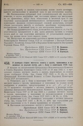 Постановление Президиума Центрального Исполнительного Комитета. О размерах ставок местного налога с грузов, привозимых и вывозимых по водным путям, для г. Баку в навигацию 1925 года. 11 сентября 1925 г.