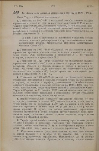 Постановление Совета Труда и Обороны. Об обязательном окладном страховании в городах на 1925-1926 г. 2 сентября 1925 г. // Распубликовано в № 219 Известий ЦИК Союза ССР и ВЦИК от 25 сентября 1925 г.