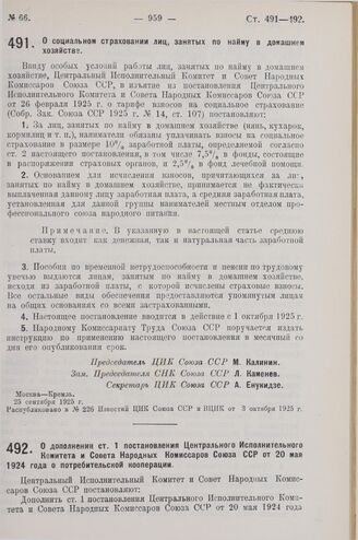 Постановление Президиума Центрального Исполнительного Комитета. О социальном страховании лиц, занятых по найму в домашнем хозяйстве. 25 сентября 1925 г. // Распубликовано в № 226 Известий ЦИК Союза ССР и ВЦИК от 3 октября 1925 г.