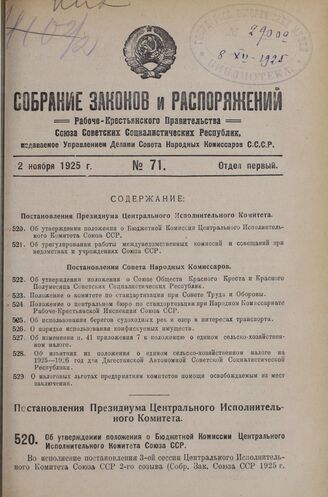 Постановление Президиума Центрального Исполнительного Комитета. Об утверждении положения о Бюджетной Комиссии Центрального Исполнительного Комитета Союза ССР. 27 марта 1925 г.