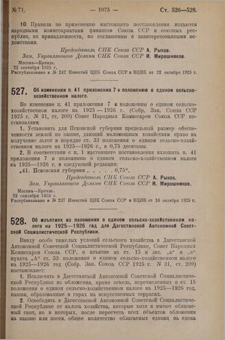 Постановление Совета Народных Комиссаров. Об изъятиях из положения о едином сельско-хозяйственном налоге на 1925-1926 год для Дагестанской Автономной Советской Социалистической Республики. 26 сентября 1925 г.