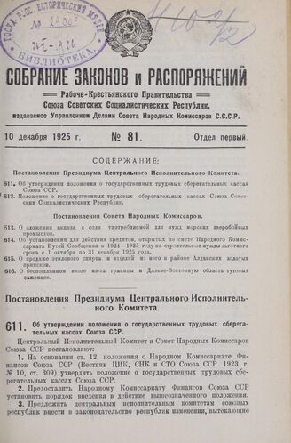 Постановление Президиума Центрального Исполнительного Комитета. Об утверждении положения о государственных трудовых сберегательных кассах Союза ССР. 27 ноября 1925 г.