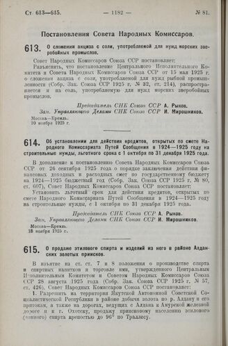 Постановление Совета Народных Комиссаров. О продаже этилового спирта и изделий из него в районе Алданских золотых приисков. 21 ноября 1925 г.