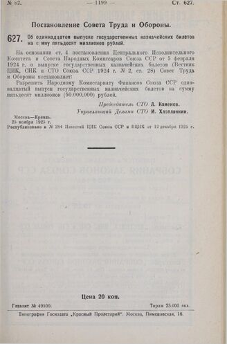 Постановление Совета Труда и Обороны. Об одиннадцатом выпуске государственных казначейских билетов на сумму пятьдесят миллионов рублей. 25 ноября 1925 г.