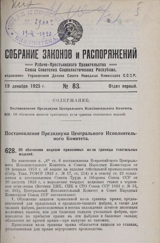 Постановление Президиума Центрального Исполнительного Комитета. Об обложении акцизом привозимых из-за границы текстильных изделий. 4 декабря 1925 г.