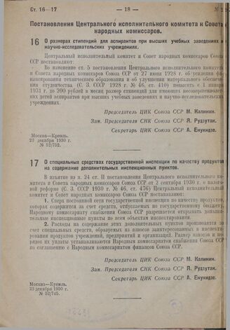 Постановление Центрального исполнительного комитета и Совета народных комиссаров. О специальных средствах государственной инспекции по качеству продуктов на содержание дополнительных инспекционных пунктов. 23 декабря 1930 г. № 52/745