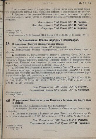 Постановление Совета народных комиссаров. О ликвидации Комитета государственных заказов. 2 января 1931 г. № 1