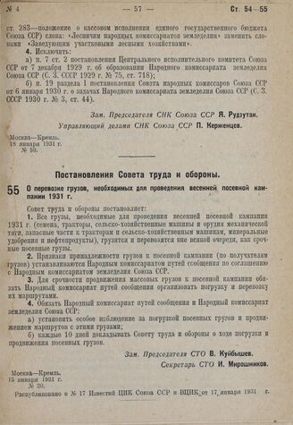 Постановление Совета труда и обороны. О перевозке грузов, необходимых для проведения весенней посевной кампании 1931 г. 15 января 1931 г. № 20