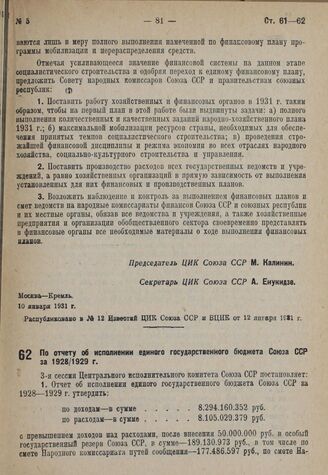 Постановление Центрального исполнительного комитета Союза ССР, принятое на 3-й сессии 5-го созыва. По отчету об исполнении единого государственного бюджета Союза ССР за 1928/1929 г. 10 января 1931 г.