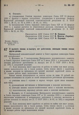 Постановление Центрального исполнительного комитета и Совета народных комиссаров. О выплате пенсии за выслугу лет работникам, имеющим помимо пенсии другие доходы. 22 января 1931 г. № 54/166