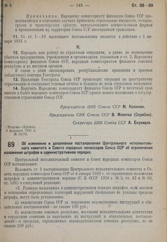 Постановление Центрального исполнительного комитета и Совета народных комиссаров. Об изменении и дополнении постановления Центрального исполнительного комитета и Совета народных комиссаров Союза ССР об ограничении наложения штрафов в административ...