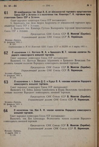 Об освобождении тов. Дедя А. А. от обязанностей торгового представителя Союза ССР в Эстонии и о назначении тов. Клингера Г. К. торговым представителем Союза ССР в Эстонии. 21 февраля 1931 г. № 157