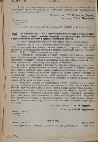 Постановление Совета труда и обороны. Об изменении ст. ст. 1 и 2 постановления Совета труда и обороны о содержании и ремонте участков шоссейных и грунтовых дорог общесоюзного и республиканского значения в пределах населенных пунктов. 26 февраля 1931 г. № 71