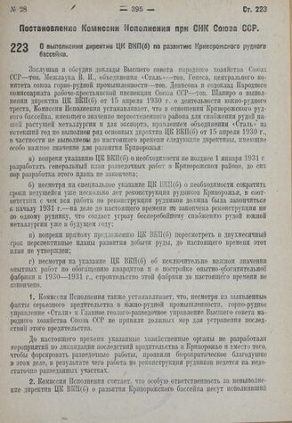 Постановление Комиссии Исполнения при СНК Союза ССР. О выполнении директив ЦК ВКП(б) по развитию Криворожского рудного бассейна. 11 мая 1931 г. № 13