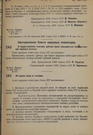 Постановление Совета народных комиссаров. Об охране лесов от пожаров. 14 мая 1931 г. № 358
