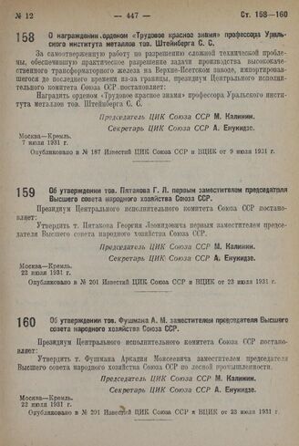 Об утверждении тов. Фушмана А. М. заместителем председателя Высшего совета народного хозяйства Союза ССР. 22 июля 1931 г. // Опубликовано в № 201 Известий ЦИК Союза ССР и ВЦИК от 23 июля 1931 г.