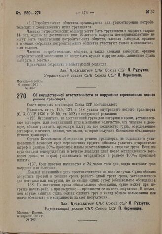 Постановление Совета народных комиссаров. Об имущественной ответственности за нарушение перевозочных планов речного транспорта. 6 апреля 1931 г. № 363