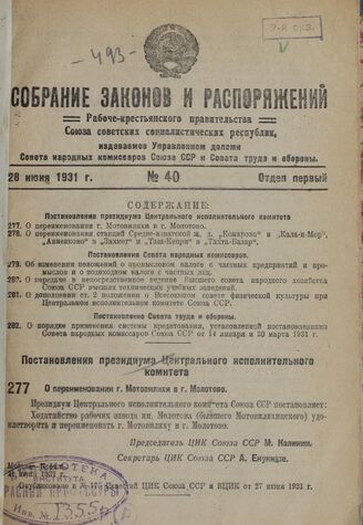 Постановление президиума Центрального исполнительного комитета. О переименовании г. Мотовилихи в г. Молотово. 21 июня 1931 г. // Опубликовано в № 175 Известий ЦИК Союза ССР ВЦИК от 27 июня 1931 г.