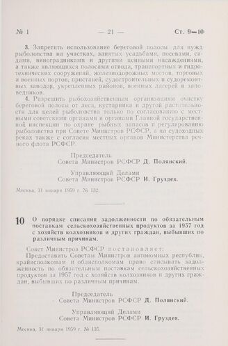 Постановление Совета Министров РСФСР. О порядке списания задолженности по обязательным поставкам сельскохозяйственных продуктов за 1957 год с хозяйств колхозников и других граждан, выбывших по различным причинам. 31 января 1959 г. № 135