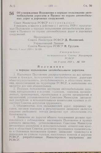 Постановление Совета Министров РСФСР. Об утверждении Положения о порядке пользования автомобильными дорогами и Правил по охране автомобильных дорог и дорожных сооружений. 9 июня 1959 г. № 930