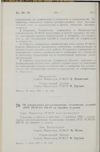 Постановление Совета Министров РСФСР. Об утверждении республиканских технических условий (РТУ РСФСР) 659-59 на пианино и рояли. 4 июля 1959 г. № 1156