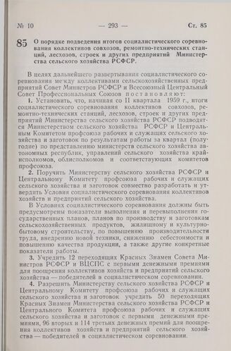 Постановление Совета Министров РСФСР и Всесоюзного Центрального Совета Профессиональных Союзов. О порядке подведения итогов социалистического соревнования коллективов совхозов, ремонтно-технических станций, лесхозов, строек и других предприятий Ми...