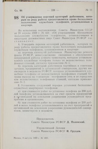 Главная Собрание законов и распоряжений правительства РСФСР и СССР Собрание законов и распоряжений Рабоче-Крестьянского Правительства ... Собрание постановлений правительства РСФСР за 1959 г. № 1-21 Документы Постановление Совета Министров РСФСР. Об утверждении перечней катег...
