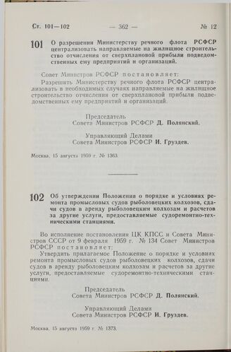 Постановление Совета Министров РСФСР. Об утверждении Положения о порядке и условиях ремонта промысловых судов рыболовецких колхозов, сдачи судов в аренду рыболовецким колхозам и расчетов за другие услуги, предоставляемые судоремонтно-техническими ...