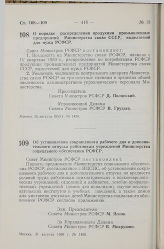 Постановление Совета Министров РСФСР. О порядке распределения продукции промышленных предприятий Министерства связи СССР, выделяемой для нужд РСФСР. 26 августа 1959 г. № 1434