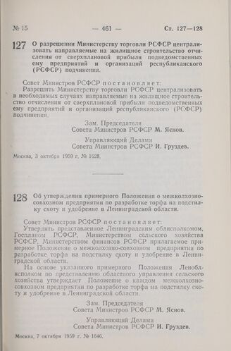 Постановление Совета Министров РСФСР. Об утверждении примерного Положения о межколхозно-совхозном предприятии по разработке торфа на подстилку скоту и удобрение в Ленинградской области. 7 октября 1959 г. № 1646