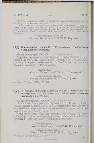 Постановление Совета Министров РСФСР. О ставках арендной платы за нежилые помещения, используемые для продажи полуфабрикатов и изделий кулинарии в г. Москве. 25 ноября 1959 г. № 1860