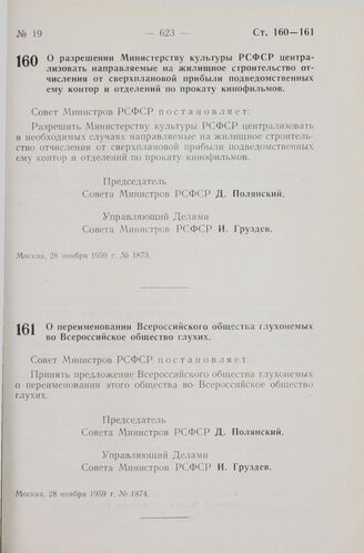 Постановление Совета Министров РСФСР. О разрешении Министерству культуры РСФСР централизовать направляемые на жилищное строительство отчисления от сверхплановой прибыли подведомственных ему контор и отделений по прокату кинофильмов. 28 ноября 1959...