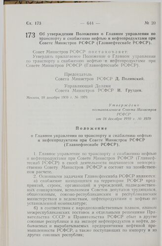 Постановление Совета Министров РСФСР. Об утверждении Положения о Главном управлении по транспорту и снабжению нефтью и нефтепродуктами при Совете Министров РСФСР (Главнефтеснабе РСФСР). 18 декабря 1959 г. № 1979