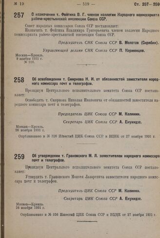 О назначении т. Фейгина В. Г. членом коллегии Народного комиссариата рабоче-крестьянской инспекции Союза ССР. 9 ноября 1931 г. № 916