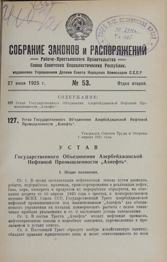Устав Государственного Объединения Азербейджанской Нефтяной Промышленности «Азнефть». Утвержден Советом Труда и Обороны 1 апреля 1925 года