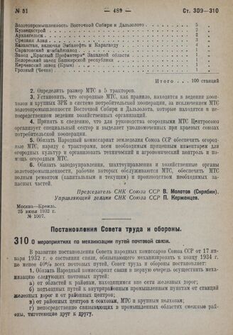 Постановление Совета труда и обороны. О мероприятиях по механизации путей почтовой связи. 20 июня 1932 г. № 730