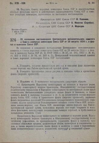 Постановление Центрального Исполнительного Комитета и Совета Народных Комиссаров. Об изменении постановления Центрального исполнительного комитета и Совета народных комиссаров Союза ССР от 29 августа 1924 г. о флагах и вымпелах Союза ССР. 7 июля 1932 г. № 42/1003