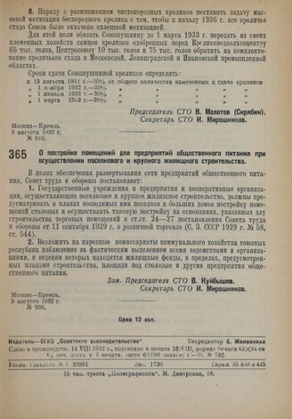 Постановление Совета труда и обороны. О постройке помещений для предприятий общественного питания при осуществлении поселкового и крупного жилищного строительства. 9 августа 1932 г. № 938