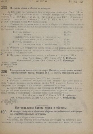 Постановление Совета труда и обороны. О размерах налогового обложения оборотов потребительской кооперации по децентрализованным заготовкам. 3 августа 1932 г. № 922