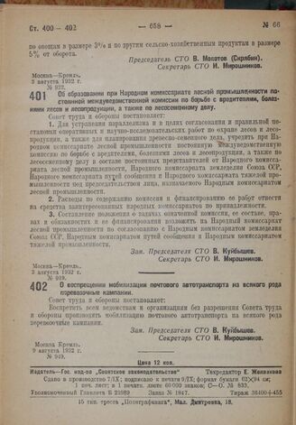 Постановление Совета труда и обороны. О воспрещении мобилизации почтового автотранспорта на всякого рода перевозочные кампании. 9 августа 1932 г. № 949