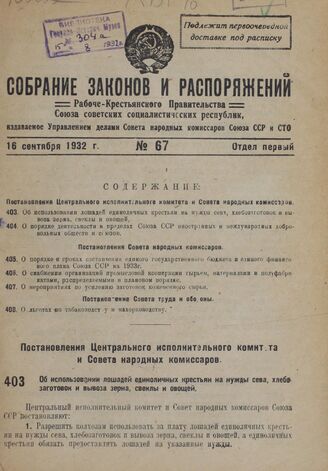 Постановление Центрального Исполнительного Комитета и Совета Народных Комиссаров. Об использований лошадей единоличных крестьян на нужды сева, хлебозаготовок и вывоза зерна, свеклы и овощей. 11 сентября 1932 г.