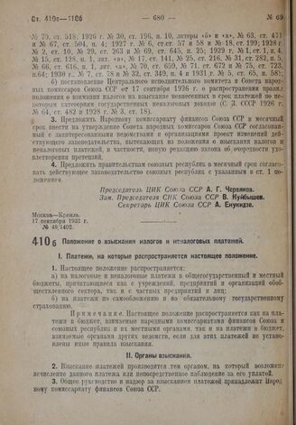 Постановление Центрального Исполнительного Комитета и Совета Народных Комиссаров. Положение о взыскании налогов и неналоговых платежей. 17 сентября 1932 г. № 48/1402