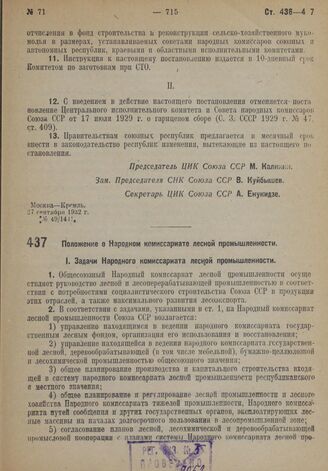 Постановление Центрального Исполнительного Комитета и Совета Народных Комиссаров. Положение о Народном комиссариате лесной промышленности. 17 сентября 1932 г.