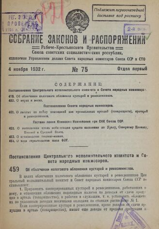Постановление Центрального Исполнительного Комитета и Совета Народных Комиссаров. Об облегчении налогового обложения кустарей и ремесленников. 27 сентября 1932 г. № 52/1627