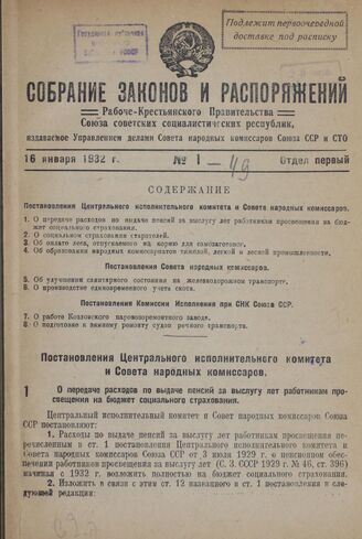 Собрание законов и распоряжений Рабоче-Крестьянского Правительства СССР за 1932 г. № 1-49. Отдел первый. — М.: Сов. законодательство, 1932.