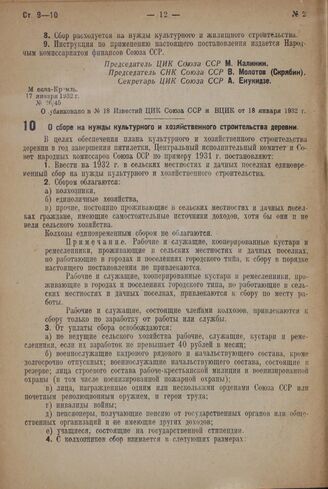 Постановление Центрального Исполнительного Комитета и Совета Народных Комиссаров. О сборе на нужды культурного и хозяйственного строительства деревни. 17 января 1932 г. № 26/44