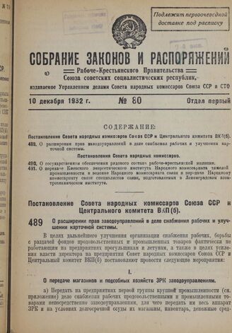 Постановление Совета Народных Комиссаров Союза ССР и Центрального комитета ВКП(б). О расширении прав заводоуправлений в деле снабжения рабочих и улучшении карточной системы. 1 декабря 1932 г.