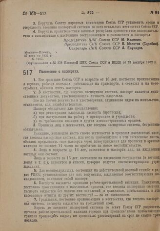 Постановление Центрального Исполнительного Комитета и Совета Народных Комиссаров. Положение о паспортах. 27 декабря 1932 г. // Опубликовано в № 358 Известий ЦИК Союза ССР и ВЦИК от 28 декабря 1932 г.