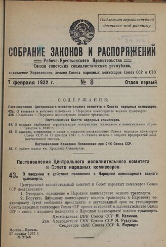 Постановление Центрального Исполнительного Комитета и Совета Народных Комиссаров. О введении в действие положения о Народном комиссариате водного транспорта. 27 января 1932 г. № 27/46